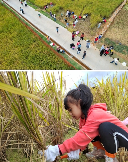 現場最熱鬧的要數水稻田里,孩子們帶著手套、手持鐮刀,在工作人員的指導和父母的幫助下一把一把地割水稻、打稻谷,稻田里的一堂課讓孩子們親身感受收獲的喜悅和“粒粒皆辛苦”的不易