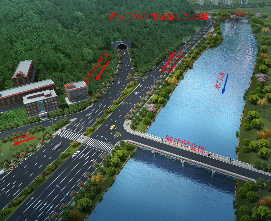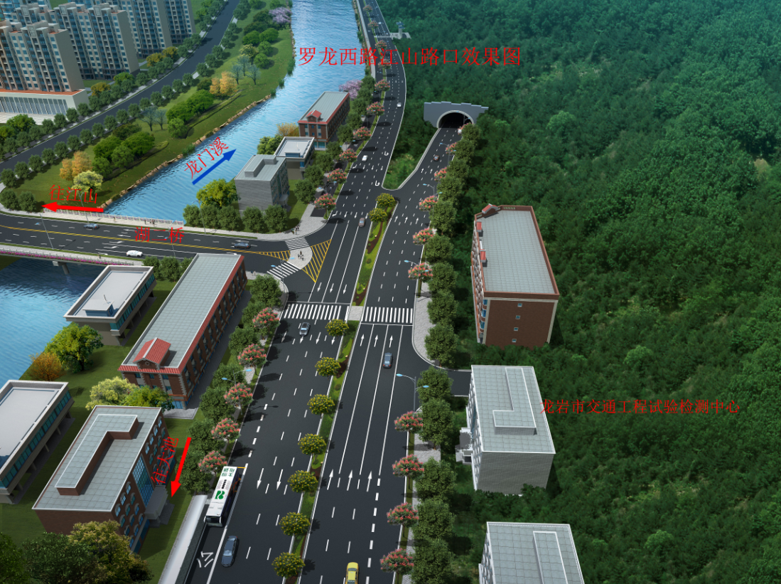 羅龍西路是連接龍巖西高速出入口與中心城市的唯一通道,其規(guī)劃改造范圍從紅竹山橋至御佳園路口,全長3855米,計劃將原道路拓寬至40米,實行雙向六車道,兩旁設(shè)2.5米非機動車道,并在湖二橋路口以東設(shè)640米入城單向三車道隧道連接至御佳園路口,原羅龍西路湖二橋至御佳園段將調(diào)整為出城單向車道。