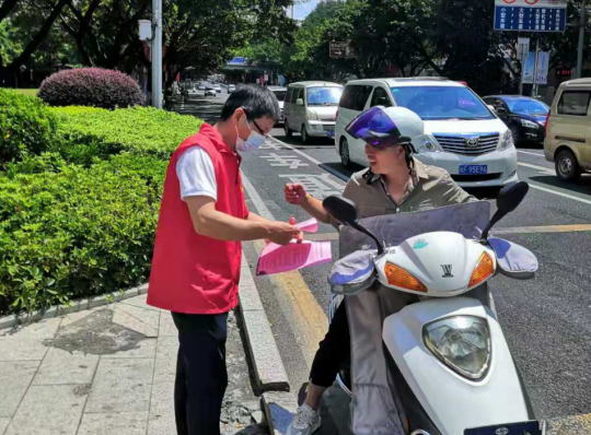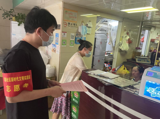 八月末,天氣炎熱,市政集團的志愿者們身著紅馬甲,不畏臟、不怕累,各司其職,分時段分批次在蓮新社區范圍內開展創城活動,其中清潔崗的志愿者們帶著夾子、掃帚、垃圾袋等清掃工具,對街道路面的紙屑、塑料袋、煙頭等生活垃圾進行清掃,將亂停亂放的自行車整齊的排列在停車位上,使得街道整潔一新。宣傳崗的志愿者們走進商鋪,發放文明宣傳標語,動員商鋪店主一起,注意門前三包,在平時營業工作中,遇到不文明行為時,進行及時規勸,讓市民自覺遵守,規范自身行為,積極踐行“共創共享”的創城理念,共同為創建文明城市出一份力。交通崗的志愿者們通過積極引導道路交通,向過往行人科普創城溫馨小知識,加強城市文明建設。