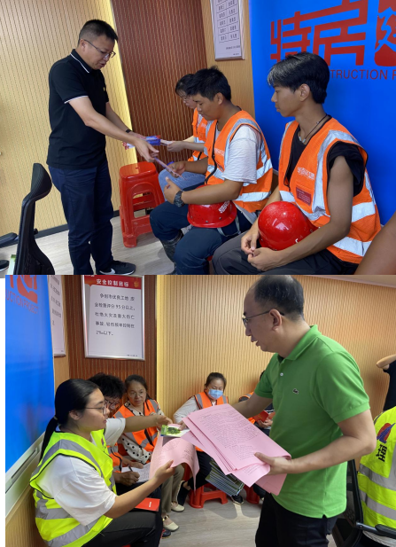 會后,黨支部書記、副董事長、總經理孔華修海金副總經理分別向項目部人員及工人現場分發安全生產月宣傳單及“五進”等宣傳資料。